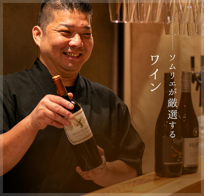- ソムリエである店主が、お料理にあわせて幅広く取り揃えたワインの数々。ペアリングによって、その美味しさは何倍にも広がります。お好みの一杯をご提案することもできますので、気軽にお申し付けください。