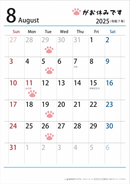 2025.8月のお休みは5、11、19、26日です。