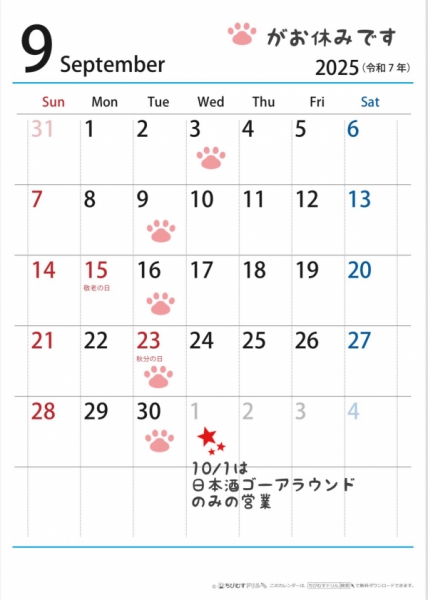 2025.9月のお休みは、3、9、16、23、30日です。