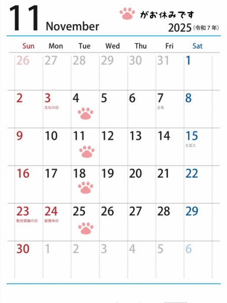2025.11月のお休みは、火曜日です。
