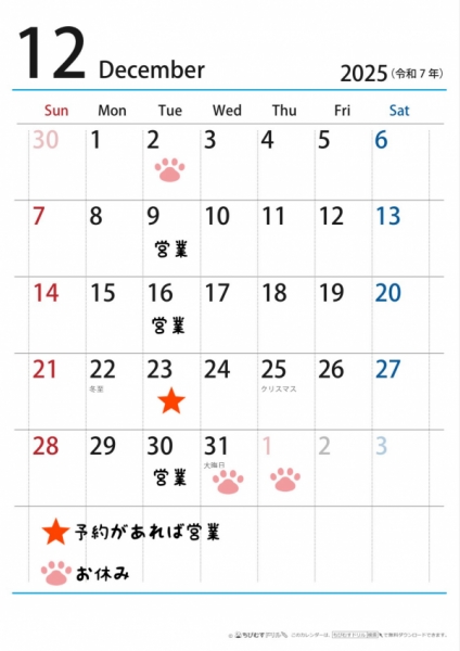 追記:12/9、16、30日はご予約がありましたので営業いまします。